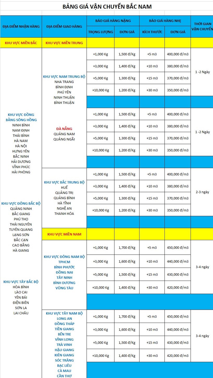 Bảng giá cước phí vận chuyển hàng hóa bắc nam